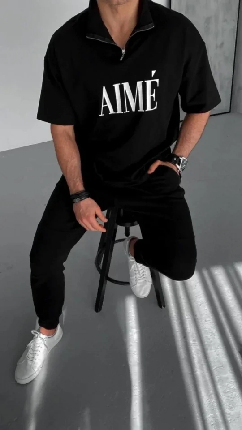 Unisex Yarım Fermuarlı Baskılı T-Shirt - Siyah