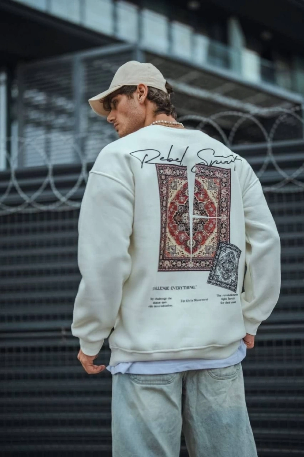 Erkek Sırt Baskılı Oversize Üç İplik Kapüşonlu Sweatshirt - Beyaz