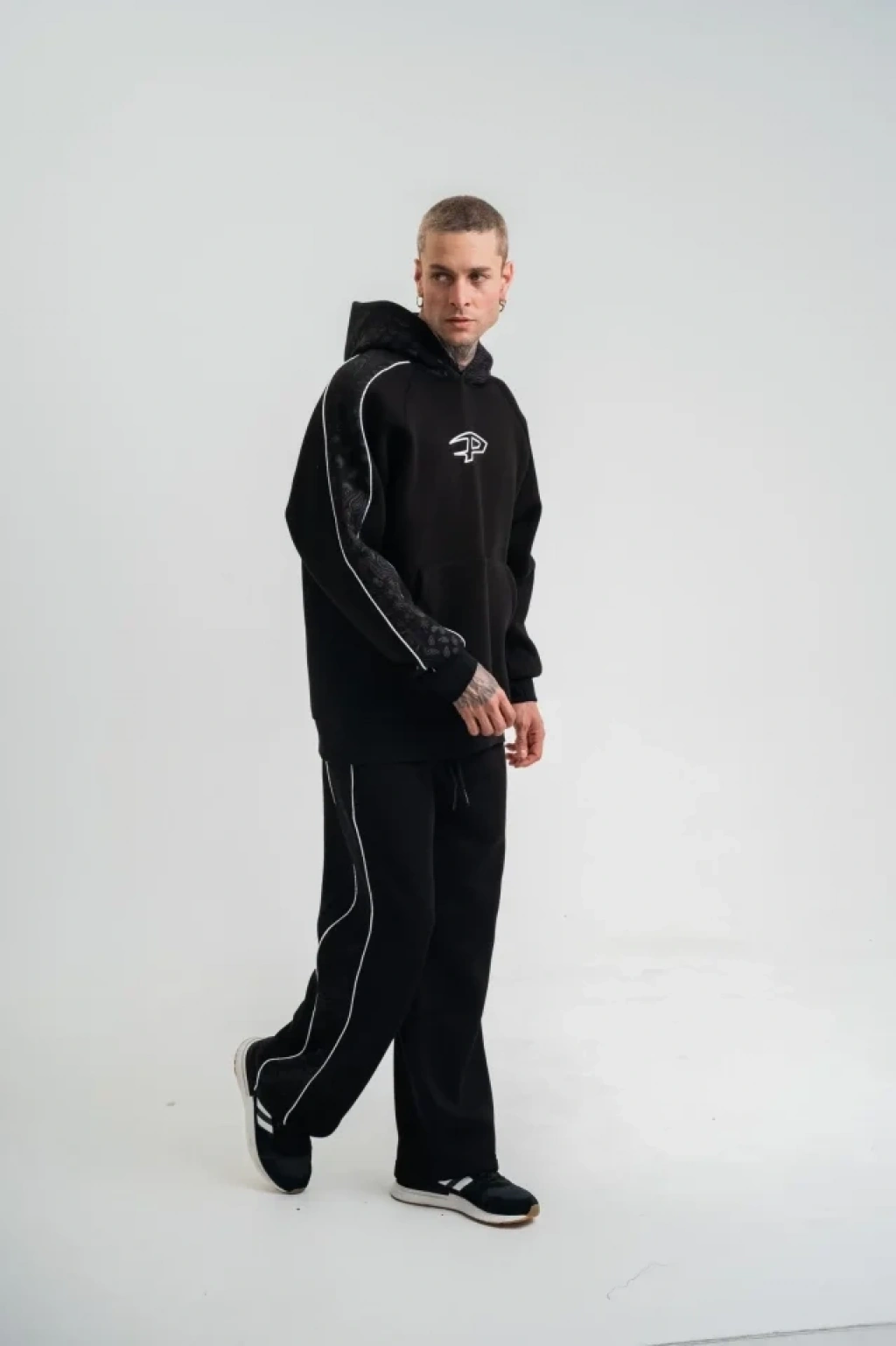 Uzun Kol Kapşonlu Ara Biyeli Baggy Eşofman Takım - Siyah